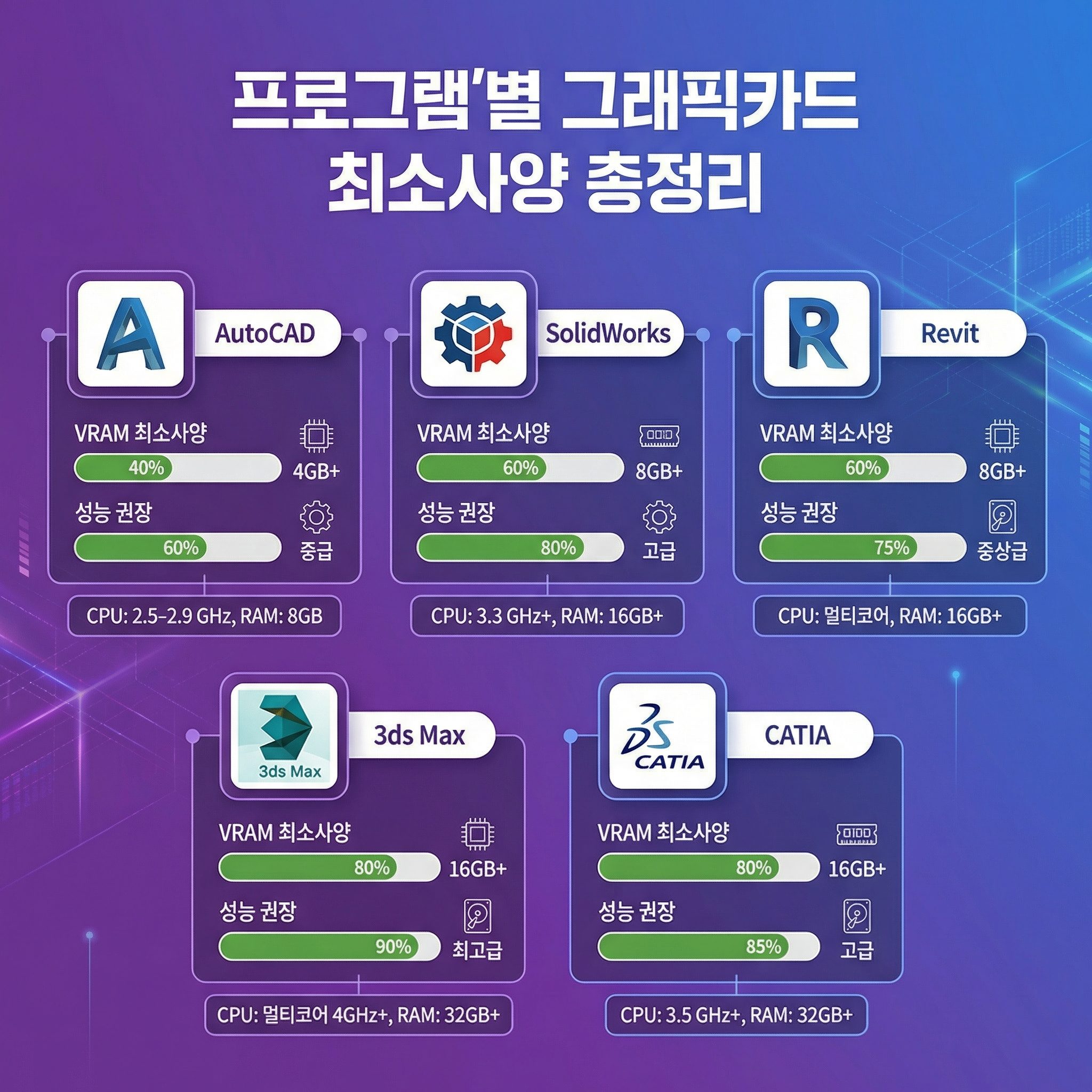 여기가 이 글의 핵심입니다! 🎯 각 CAD 프로그램이 요구하는 그래픽카드 사양을 정리했어요.