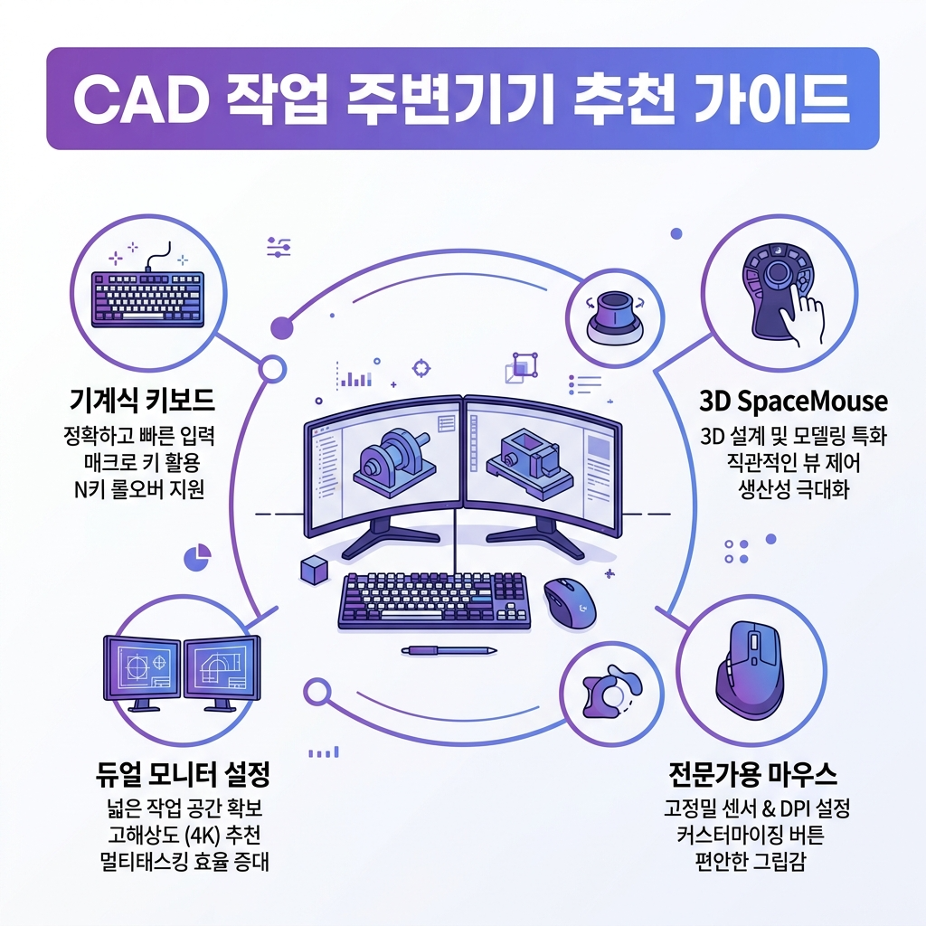 CAD 작업 주변기기만 제대로 갖춰도 작업 효율이 정말 달라져요. 좋은 컴퓨터 사양도 중요하지만, 하루 종일 손에 쥐고 있는 마우스와 키보드, 그리고 눈으로 보는 모니터가 편해야 피로도가 확 줄어들거든요.