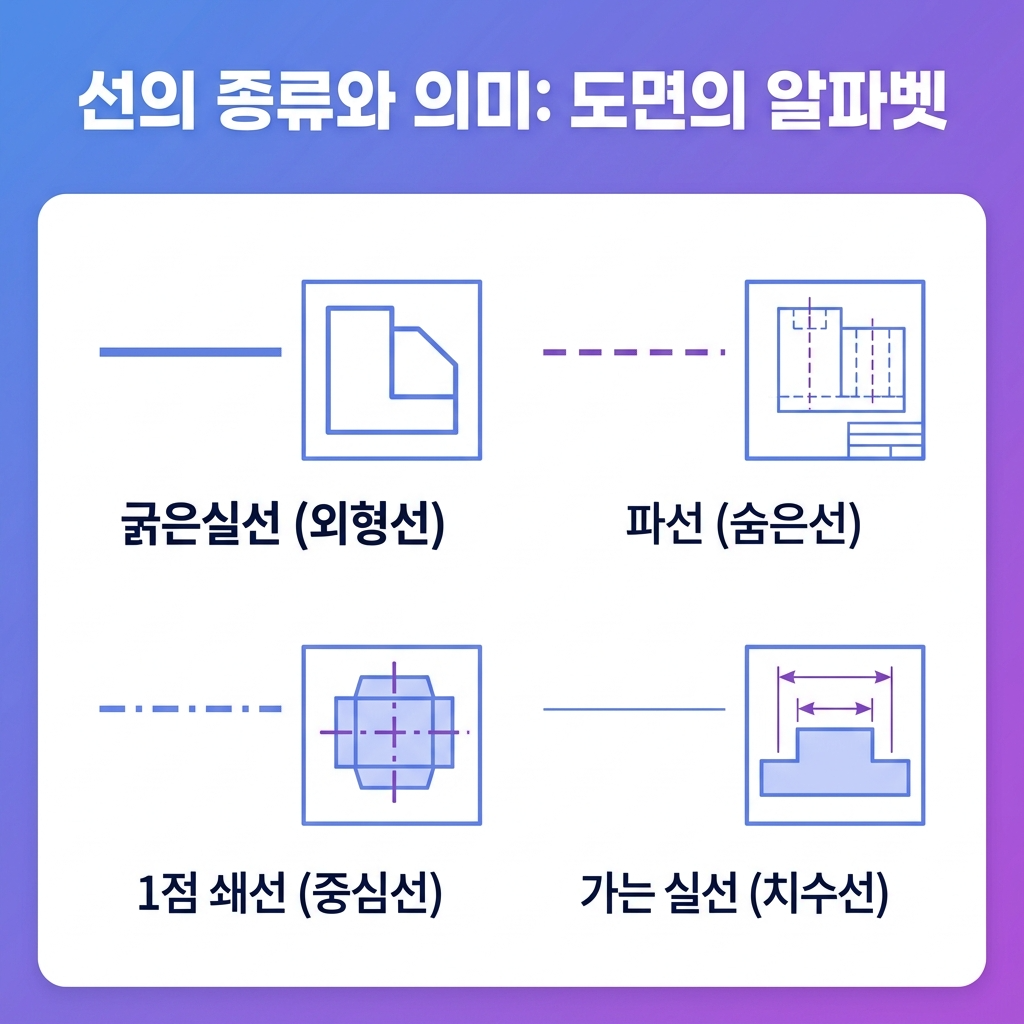 도면에서 선은 단순히 '그어진 줄'이 아니라 각각 다른 정보를 담고 있어요. CAD 화면에서는 색깔로 구분하지만, 출력하면 모두 검은색이 되니까 선의 모양과 굵기로 의미를 구분해야 해요.