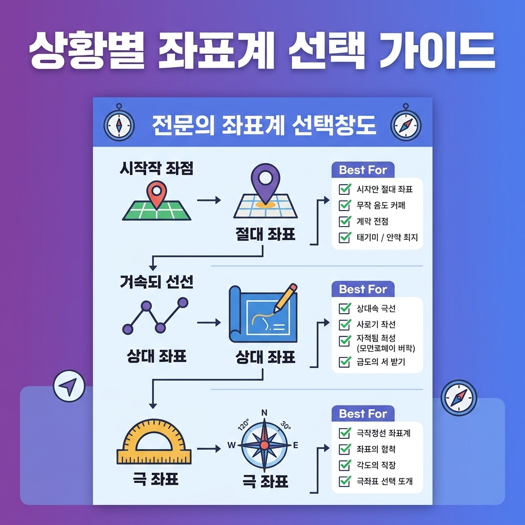 실무에서는 세 가지 좌표를 섞어서 사용해요. 어떤 상황에서 어떤 좌표를 쓰면 좋을지 정리해드릴게요.